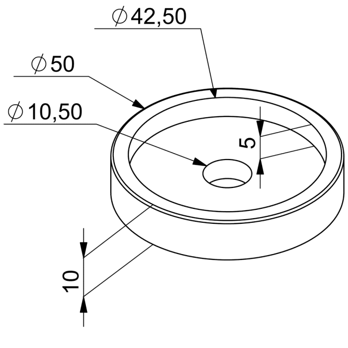 Cette platine au sol pour tube de diamètre 42.4 mm est composée d'AISI 304 et fabriquée par Inox Design. Ce modèle de platine mesure 50 mm de diamètre, avec un trou au centre de 10,50 mm de diamètre pour fixer le tube. Un rebord de 5 mm d'épaisseur s'ajoute à l'épaisseur de 5 mm de la platine, ce qui amène la platine à mesurer 10 mm d'épaisseur au total. Elle permet de fixer un tube de 42,4 mm de diamètre.